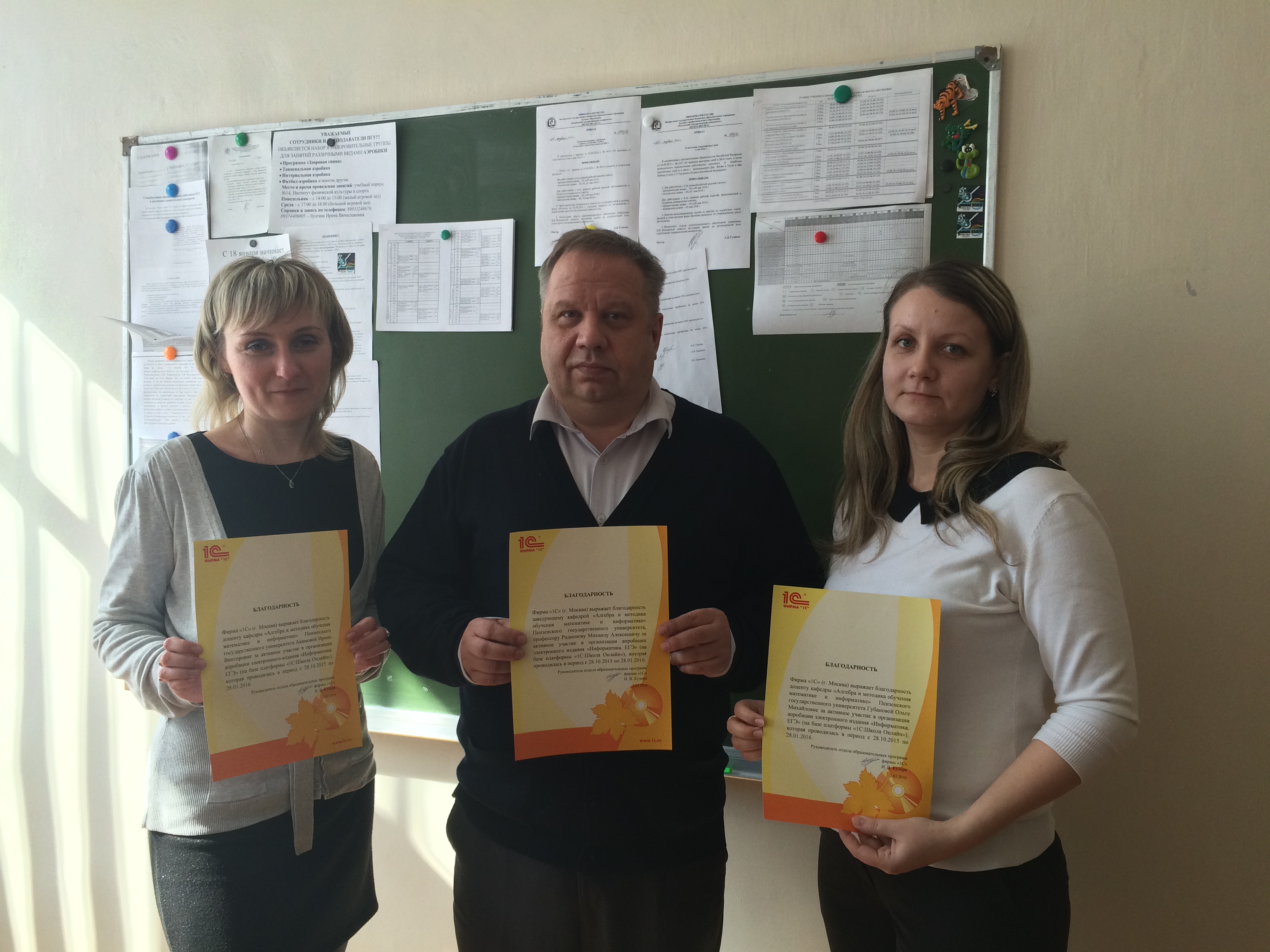 Неделя науки, проходившая в ПИ им. В.Г. Белинского, закончилась на кафедре ИиМОИМ вручением грамот и благодарственных писем от одной из ведущих отечественных IT-компаний «1С». В текущем году преподаватели кафедры: зав.каф. Родионов М.А., доценты Акимова И.В., Болотский А.В., Губанова О.М., Кочеткова О.А., Пудовкина Ю.Н., а также студенты 3-4 курсов профиля «Информатика» принимали участие в апробации онлайн-сервиса «1С» для подготовки к ЕГЭ по информатике.