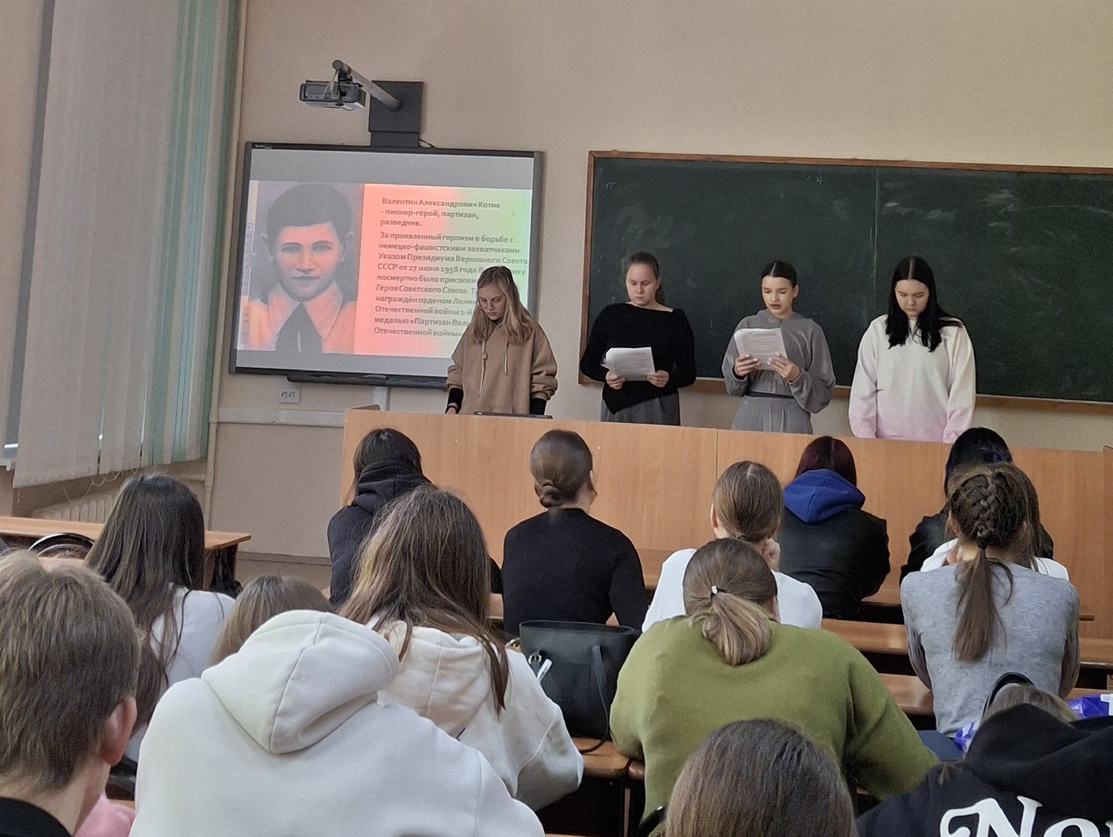 Юные патриоты тоже стремились внести свой вклад в победу, что доказано на примере таких ребят, как Зина Портнова, Леонид Голиков, Валентин Котик и других, о подвиге которых рассказали первокурсницы Филимонова Дарья, Костикова Марина, Пильгаева Марина и Утенкова Виктория. Девушки представили интерактивные доклады о доблести молодых героев, обращая внимание, насколько их жертва была значима для Победы в то время.